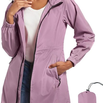 Women’s Long Packable Raincoat Waterproof Rain Jacket Lightweight Outdoor Windbreaker with Hood